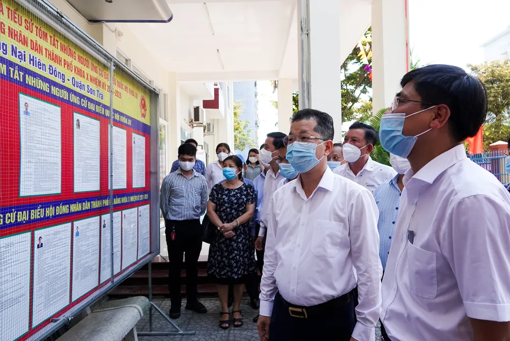 Lãnh đạo Thành ủy, HĐND TP Đà Nẵng kiểm tra một điểm bầu cử trên địa bàn quận Sơn Trà. Ảnh: XUÂN QUỲNH