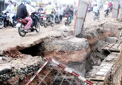 Nhiều ngày nay, nhiều người lưu thông qua tỉnh lộ 43 đoạn công trình thi công cầu qua kênh Ba Bò thuộc phường Bình Chiểu (Q.Thủ Đức, TPHCM) đang lo sợ sụp vào nhiều cái “bẫy” nguy hiểm nằm bên đường (ảnh). Tại đây, hàng rào do đơn vị thi công dựng lên đã ngã xuống để hiện lên mặt đường nhiều hố sâu, “chông” sắt lổm chổm. Đoạn đường này thường có đông người, xe tham gia giao thông, nhất là khi công nhân tan ca.