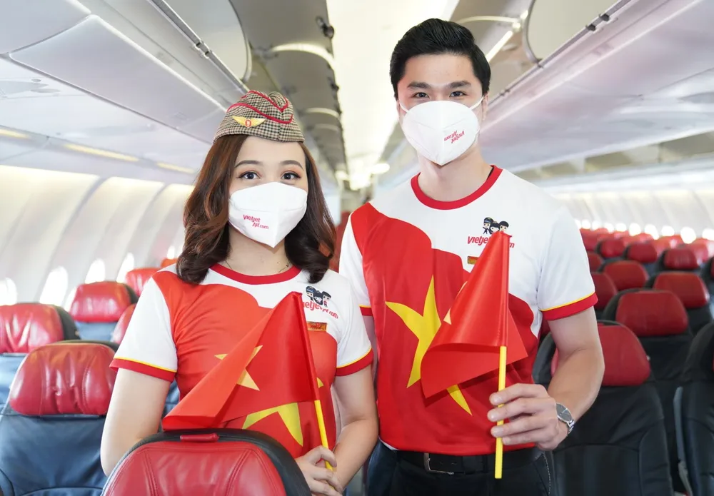 Khách hàng bay cùng Vietjet trong dịp Quốc khánh 2-9 bất ngờ khi được chào đón bởi phi hành đoàn mặc trang phục cách điệu mang hình ảnh quốc kỳ Việt Nam và những giai điệu tự hào.