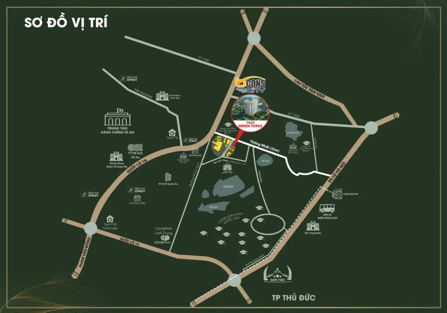 Tọa lạc mặt tiền đại lộ Thống Nhất, TP Dĩ An (Bình Dương), Bcons City sở hữu vị trí tâm điểm giữa hai trục đường huyết mạch là Thống Nhất và QL 1K, liền kề TP Thủ Đức. Trở thành tâm điểm kết nối đa chiều, là cửa ngõ kết nối tứ giác vàng kinh tế Đông Nam bộ, Bcons City hưởng lợi kép từ hạ tầng “siêu kết nối” của TP Thủ Đức và quy hoạch cơ sở hạ tầng đồng bộ của TP Dĩ An.