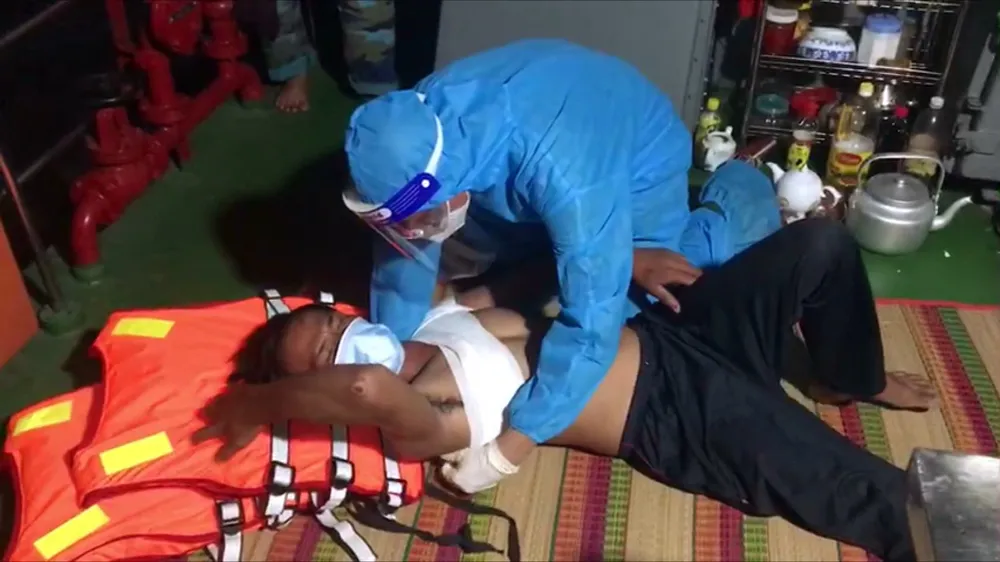 Đến 18 giờ, tàu cứu hộ đã tiếp cận được tàu cá trên, tổ chức tiếp nhận thuyền viên bị nạn lên tàu, quân y đơn vị tiến hành xét nghiệm nhanh Covid-19 (cho kết quả âm tính) và cấp cứu cho bệnh nhân, khẩn trương đưa vào bờ.