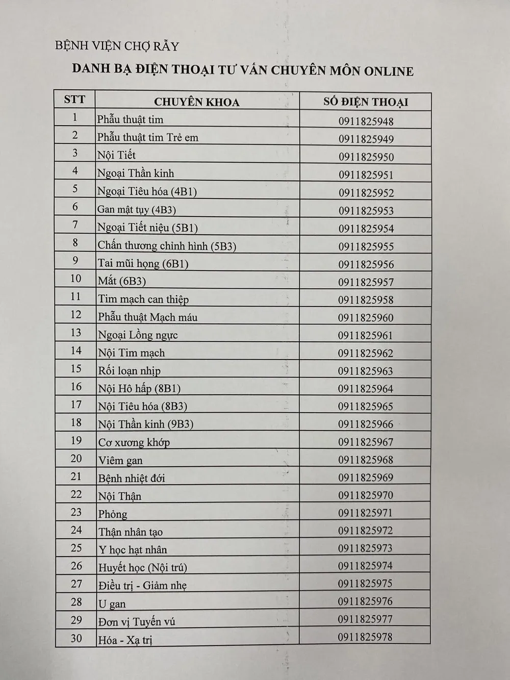 Nhằm giúp bệnh nhân ổn định tinh thần, để thân nhân bệnh nhân có thể tự chăm sóc sức khỏe cho người thân theo từng bệnh lý đặc thù, đồng thời phát hiện kịp thời các dấu hiệu bất thường của bệnh, tránh tình trạng đưa bệnh nhân đến cấp cứu trong những tình huống không cần thiết, dẫn đến nguy cơ lây nhiễm Covid-19, nhưng cũng không để bệnh nhân trở nặng mới đưa đến bệnh viện làm lỡ thời gian vàng điều trị cho bệnh nhân, Bệnh viện Chợ Rẫy đưa vào hoạt động 30 số điện thoại di động chuyên tư vấn, khám bệnh online qua điện thoại cho bệnh nhân không phải là bệnh nhân Covid-19.