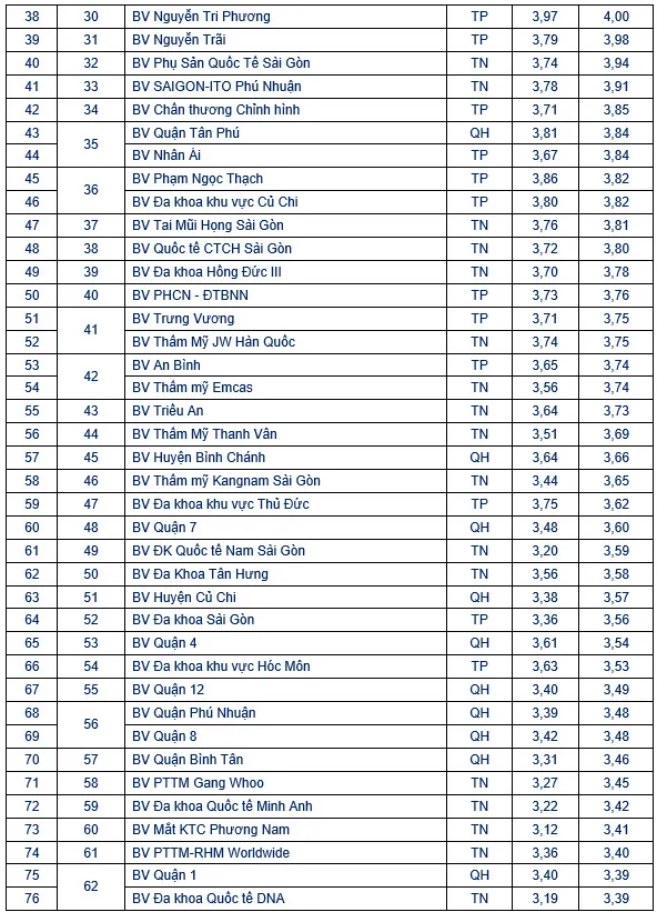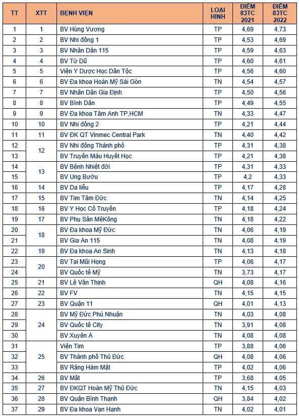 Ngày 19-7, Sở Y tế TPHCM công bố kết quả đánh giá chất lượng bệnh viện năm 2022. Kết quả đánh giá chất lượng bệnh viện ghi nhận có 37 bệnh viện đạt điểm chất lượng trung bình trên 4 (theo thang điểm 5) tăng 15,6% so với năm 2021. Số lượng bệnh viện đạt điểm dưới 2,5 chỉ còn 1 bệnh viện thuộc khối bệnh viện tư nhân.