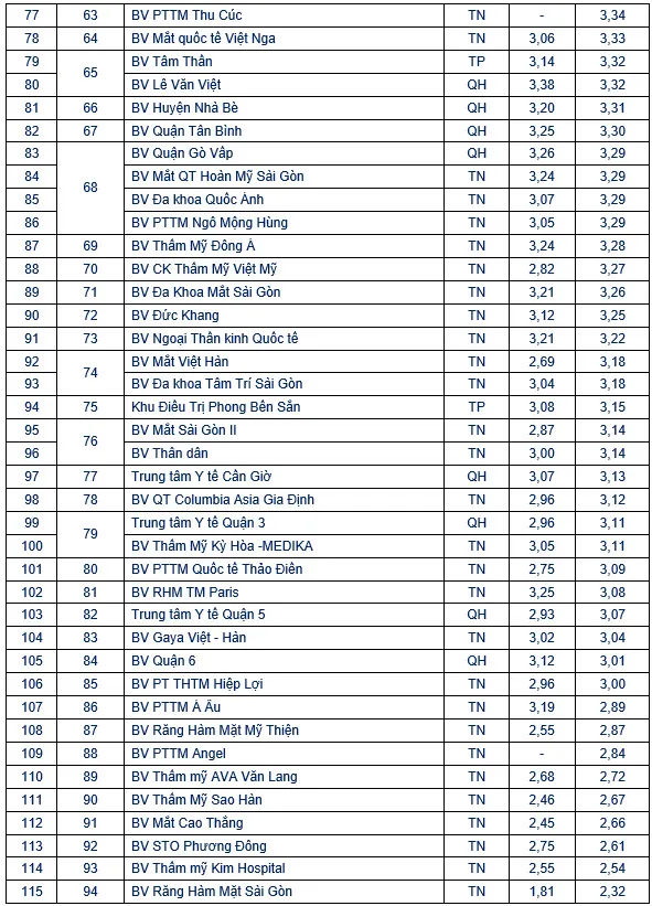 Nhóm bệnh viện tư nhân có điểm trung bình tăng 9% so với năm 2021, nhóm bệnh viện thành phố tăng 2,5% so với năm 2021 và nhóm bệnh viện quận huyện tăng 0,3% so với năm 2021. Bệnh viện Nhân dân 115 lọt vào top 3 bệnh viện có chất lượng tốt năm 2022 sau Bệnh viện Hùng Vương và Nhi đồng 1.