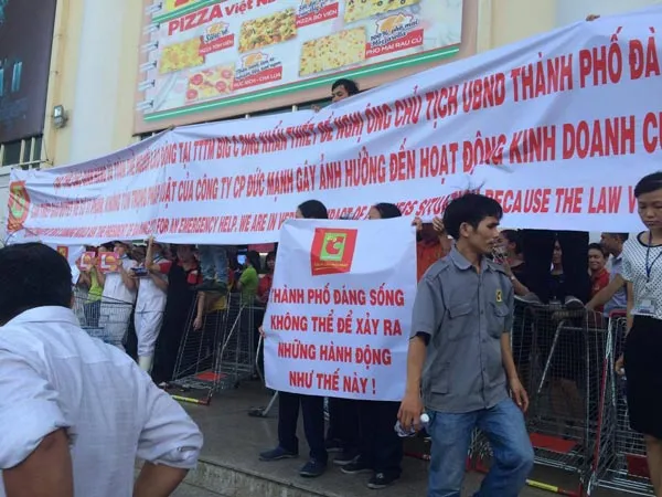 Vào khoảng 17 giờ 30 ngày 7-7, hàng trăm người là nhân viên, chủ các gian hàng tại Trung tâm thương mại BigC (phường Vĩnh Trung, quận Thanh Khê, TP Đà Nẵng) tập trung trước tòa nhà Vĩnh Trung Plaza (đường Hùng Vương) phản đối Công ty CP Đức Mạnh (DMC) Đà Nẵng.