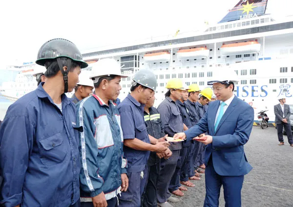 Bí thư Thành ủy Đà Nẵng Nguyễn Xuân Anh lì xì đầu xuân cho công nhân Cảng Tiên Sa Đà Nẵng.