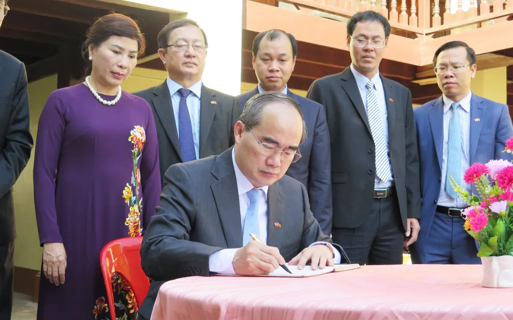 Ngay sau đó, đoàn đã đặt vòng hoa và thắp hương tại Khu tưởng niệm Bác Hồ tại tỉnh Savannakhet; thắp hương tại gian nhà lưu niệm Chủ tịch Cayson Phomvihan. Đoàn cũng đến dâng hoa và trồng cây lưu niệm tại Đài tưởng niệm Chủ tịch Cayson Phomvihan.