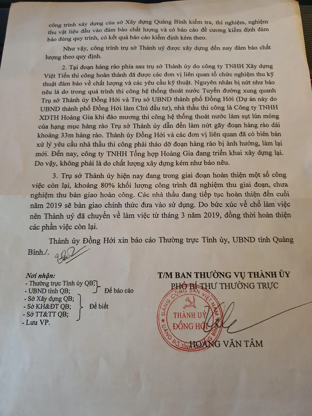 Trước sự chỉ đạo này, ông Hoàng Văn Tâm, Phó Bí thư Thường trực Thành ủy Đồng Hới, đã có Báo cáo số 284-BC/TU ngày 25-9 gửi Thường trực Tỉnh ủy, UBND tỉnh, các sở ban ngành liên quan.