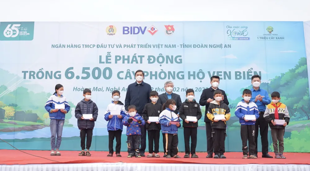 Ngày 22-2, Ngân hàng TMCP Đầu tư và Phát triển Việt Nam (BIDV) phối hợp Tỉnh đoàn Nghệ An tổ chức Lễ phát động trồng 6.500 cây phòng hộ ven biển tại xã Quỳnh Liên, thị xã Hoàng Mai, tỉnh Nghệ An.