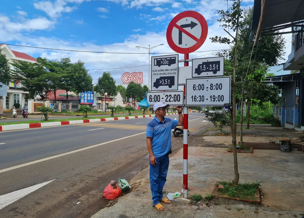 Những biển báo này được cắm trên vỉa hè có chiều cao khoảng 1,6m, ngang tầm mặt của người đi bộ (ảnh). Người dân sống gần đó phải dùng băng keo dán các góc của biển báo lại, nhằm hạn chế nguy hiểm cho người đi bộ.