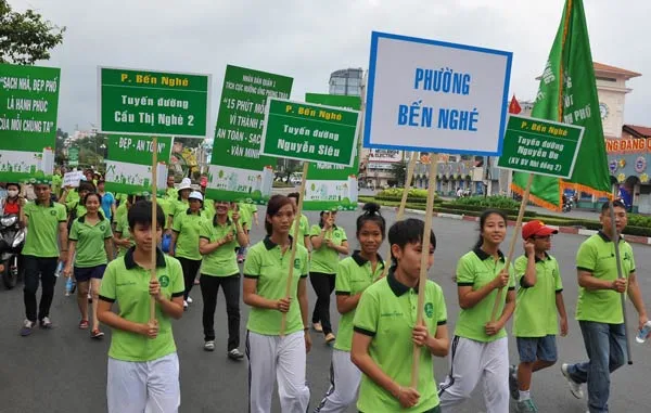 Thanh niên quận 1 TPHCM đi bộ đồng hành kêu gọi người dân thực hiện nếp sống văn minh Ảnh: VIỆT DŨNG