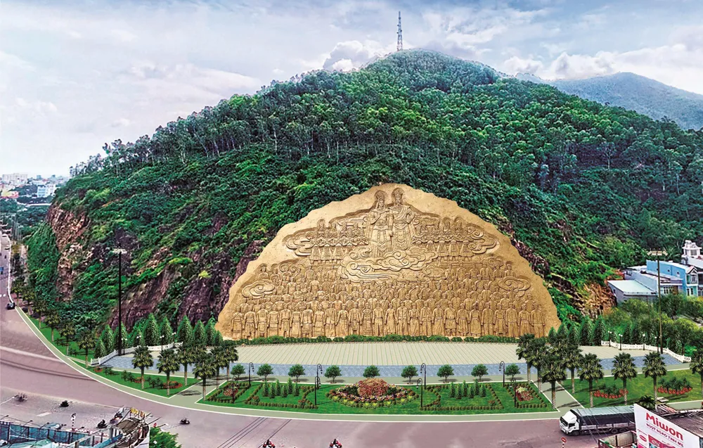 Theo ông Trung, bức phù điêu trên có tổng chiều dài 81,5m; vị trí cao nhất 35m; hệ thống sân vườn, cảnh quan kiến trúc phụ trợ khoảng 3.000m2…