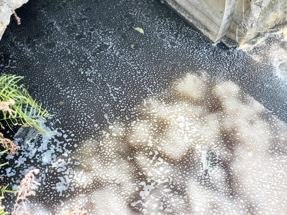 Cả mương thoát nước có màu sẫm sủi bọt trắng xóa bên nhà máy bia |