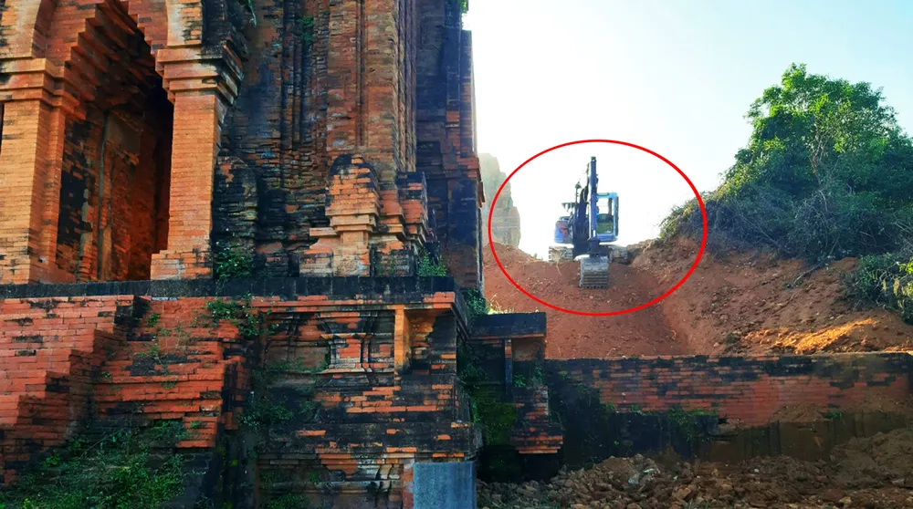 Cụ thể, đơn vị thi công huy động máy móc đến cụm tháp để san bạt, đào bới thi công các hạng mục gần chân tháp. Ngoài ra, đơn vị thi công san bạt nhiều mảng cây xanh quanh khu vực tháp, lối lên tháp để làm mặt bằng phục vụ các công trình, hạng mục... trông rất phản cảm, nguy cơ xâm hại, làm biến dạng di tích này.