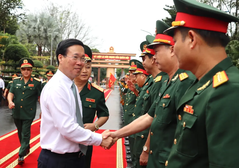 Chủ tịch nước Võ Văn Thưởng thăm hỏi cán bộ, chiến sĩ Binh đoàn 15. Ảnh: HỮU PHÚC |