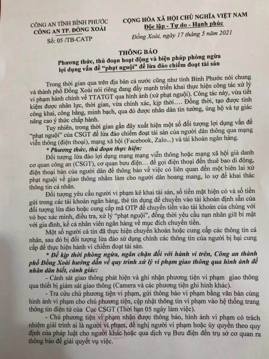 Ngày 19-5, Công an TP Đồng Xoài (tỉnh Bình Phước) cho biết vừa có thông báo phương thức, thủ đoạn hoạt động và biện pháp lợi dụng việc xử lý "phạt nguội" để lừa đảo chiếm đoạt tài sản.