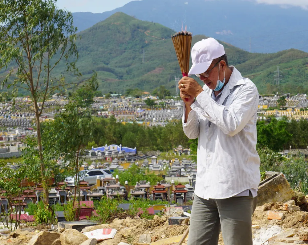 Nhặt nhạnh những viên gạch tại khu vực mộ vô danh, ông Trần Qụy (72 tuổi, trú phường Hòa Minh, quận Liên Chiểu, TP Đà Nẵng) liên tục lau nước mắt kể, giờ ông lội bộ khắp nơi bị sạt lở để thắp hương. “Sạt lở nặng nề quá! Cháu tôi còn chưa có hình hài gì cả, bộ đội cũng khó tìm nên giờ chỉ cầu nguyện cho linh hồn siêu thoát”, ông Qụy nghẹn ngào.