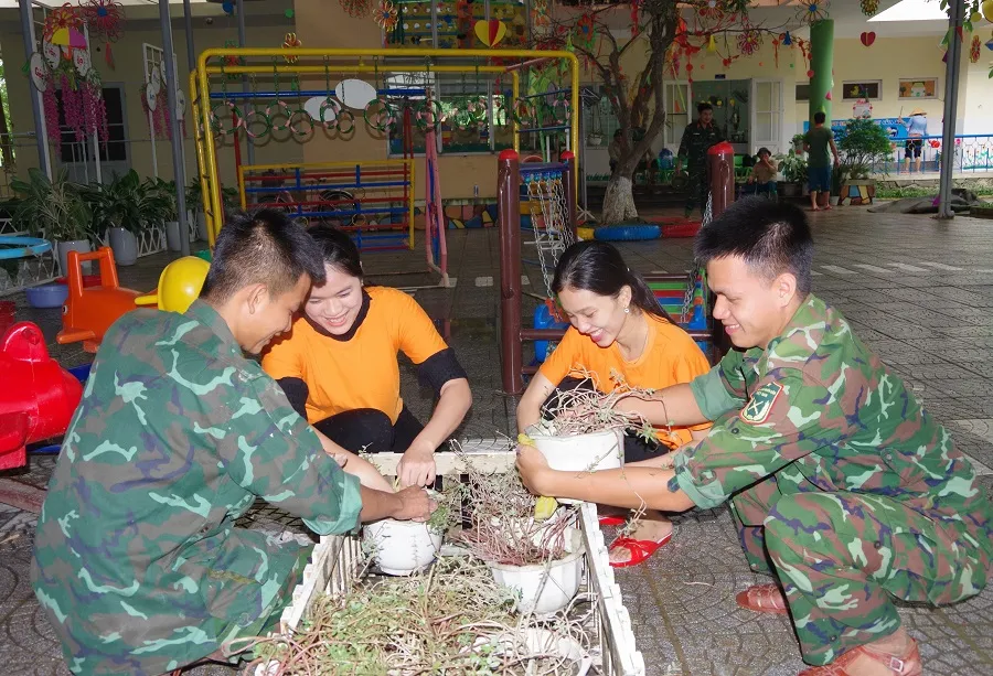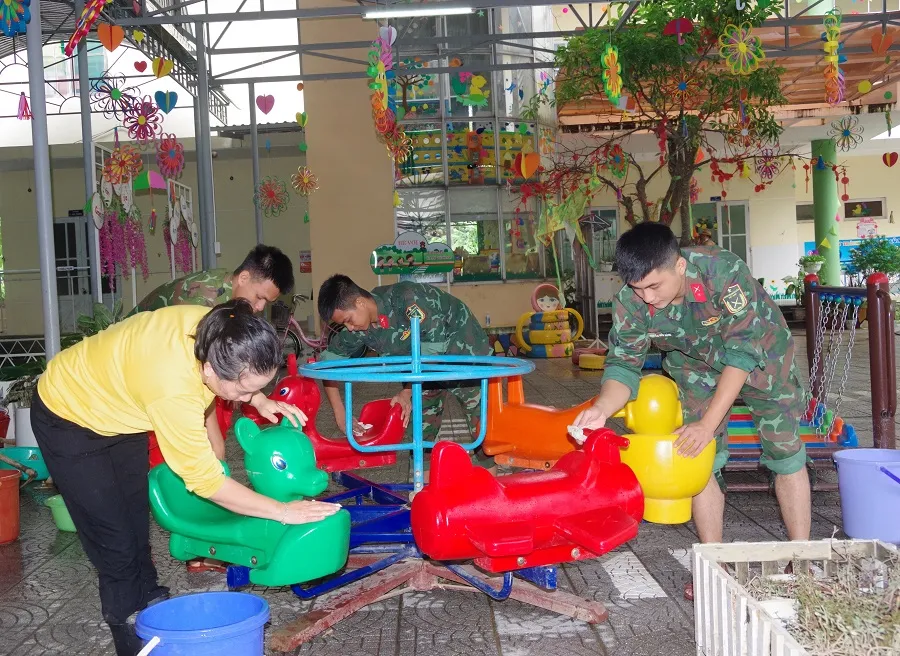 Bộ đội giúp dọn dẹp vệ sinh tại Trường Mầm non Thủy Thanh 1 |