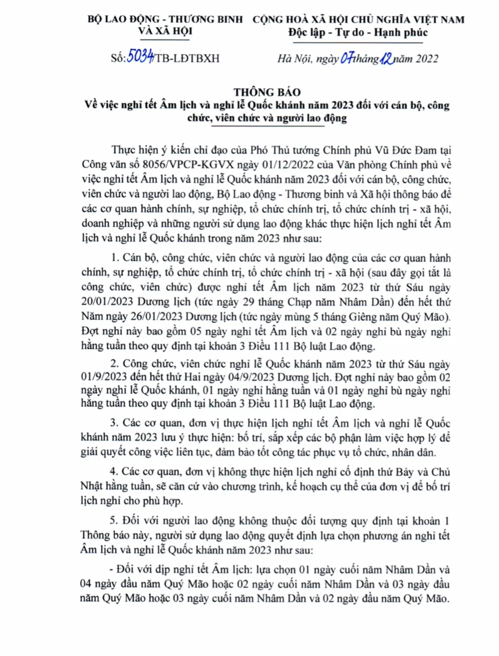 Theo phương án đã được Chính phủ phê duyệt, dịp Tết Nguyên đán 2023, công chức, viên chức được nghỉ tết từ thứ sáu ngày 20-1-2023 (tức ngày 29 tháng Chạp năm Nhâm Dần) đến hết thứ năm ngày 26-1-2023 (tức mùng 5 tháng Giêng năm Quý Mão).