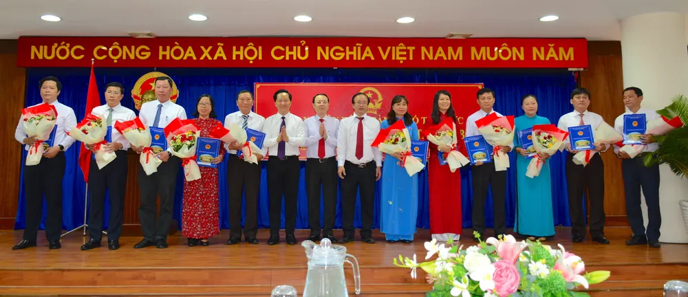 Phó Bí thư Thường trực Thành ủy Thủ Đức Nguyễn Phước Hưng chúc mừng các đồng chí được bổ nhiệm. Ảnh: KIỀU PHONG