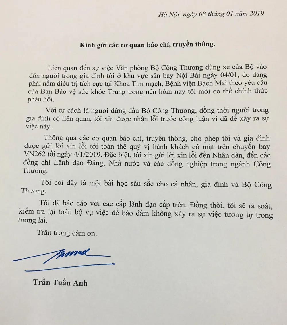 Với tư cách là người đứng đầu Bộ Công thương, đồng thời là người trong gia đình có liên quan đến chuyến bay VN262 tối ngày 4-1-2019, Bộ trưởng Trần Tuấn Anh gửi thư xin lỗi đến nhân dân, các đồng chí lãnh đạo Đảng, Nhà nước và các đồng nghiệp trong ngành công thương.