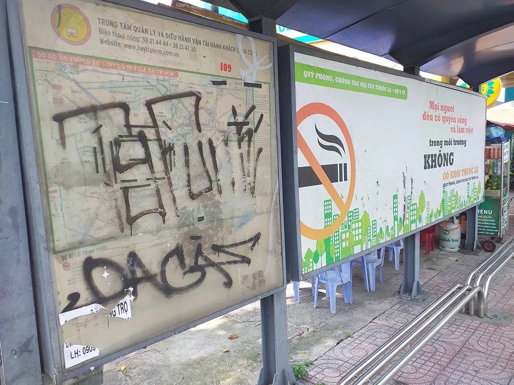 Khung bản đồ một trạm buýt tại số 913 Hoàng Sa (phường 11, quận 3, TPHCM) từ lâu bị ai đó dùng sơn màu đen viết, vẽ bậy nguệch ngoạc lên khắp bề mặt (ảnh) khiến hành khách đứng chờ buýt không thể tra cứu điểm đến cũng như thông tin hành trình của các tuyến buýt chạy qua…