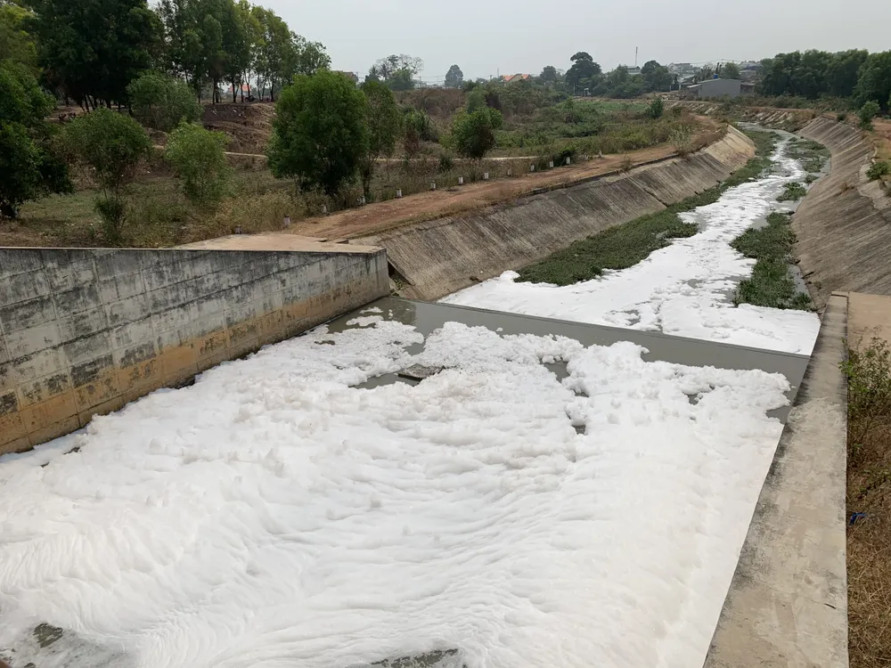 Trước đó, vào khoảng 10 giờ đêm 8-4, trên địa bàn tỉnh Bình Dương có mưa lớn và khi tạnh mưa, con kênh trên nổi bọt trắng xóa kéo dài khiến người dân bất an.