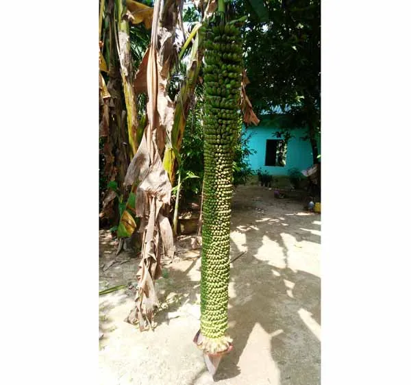 Nhiều ngày nay, người dân ở các khu vực lân cận đổ xô về vườn chị Phạm Thị Thúy tại thôn Dương Đàn, xã Tam Dân, huyện Phú Ninh để tận mắt chứng kiến cây chuối độc đáo với chiều dài buồng chuối gần 2m, chạm sát mặt đất. Trên buồng chuối là chi chít những nải chuối, đếm gần 100 nải, quả chuối mọc vòng, quấn quanh rất đẹp, buồng chuối cao hơn đầu người. Mặc dù buồng chuối đã gần chạm đất nhưng bắp chuối vẫn tiếp tục ra hoa, kết quả.