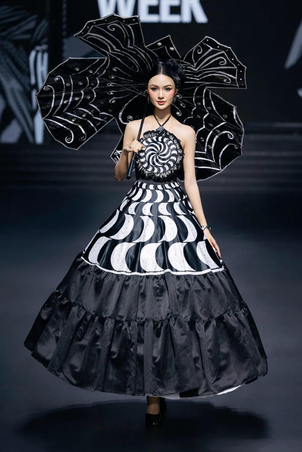 BST mang đến loạt thiết kế ứng dụng kỹ thuật hiện đại như in chuyển nhiệt, dựng phom 3D, cut-outm đính kết thủ công. Bảng màu đen – trắng – đỏ – vàng cùng những chất liệu như taffeta gấm, organza, lông nhân tạo tạo hiệu ứng thị giác mạnh mẽ. Mỗi trang phục là một lớp “ảo ảnh” chồng lớp, mô phỏng sự giằng xé, đối đầu và hồi sinh – như hành trình vượt giới hạn của NTK.