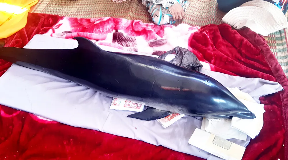 Theo ghi nhận của chúng tôi vào trưa 19-11 tại Miễu Bà (đặt tại xóm 21, thôn Vinh Quang 2), cá ông dài khoảng 1m, nặng trên 20kg, màu đen nhánh, bụng màu trắng, đuôi bẹp như đuôi tôm, bị một vết xước ở miệng, đã chết…
