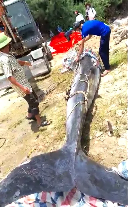 Sau khi nhận được tin báo, chính quyền xã Cẩm Lĩnh và các lực lượng chức năng đã nhanh chóng có mặt tại hiện trường, phối hợp với người dân địa phương tiến hành di chuyển xác cá voi vào bờ.