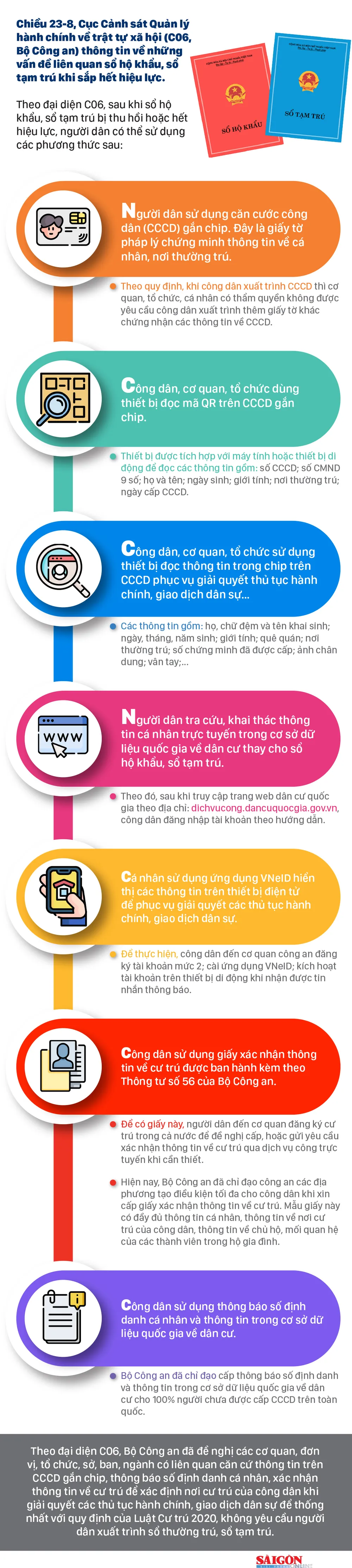 Bộ Công an cho hay, khi sổ hộ khẩu, sổ tạm trú hết hiệu lực, người dân có thể sử dụng căn cước công dân, sử dụng ứng dụng VNeID để sử dụng thay thế trong các giao dịch hành chính liên quan.