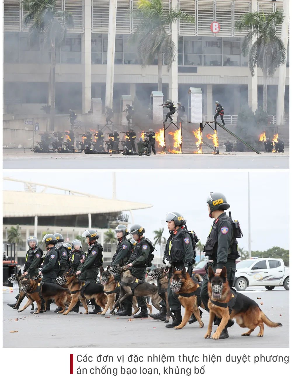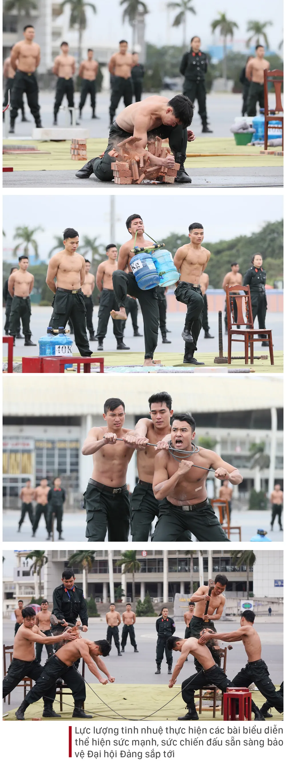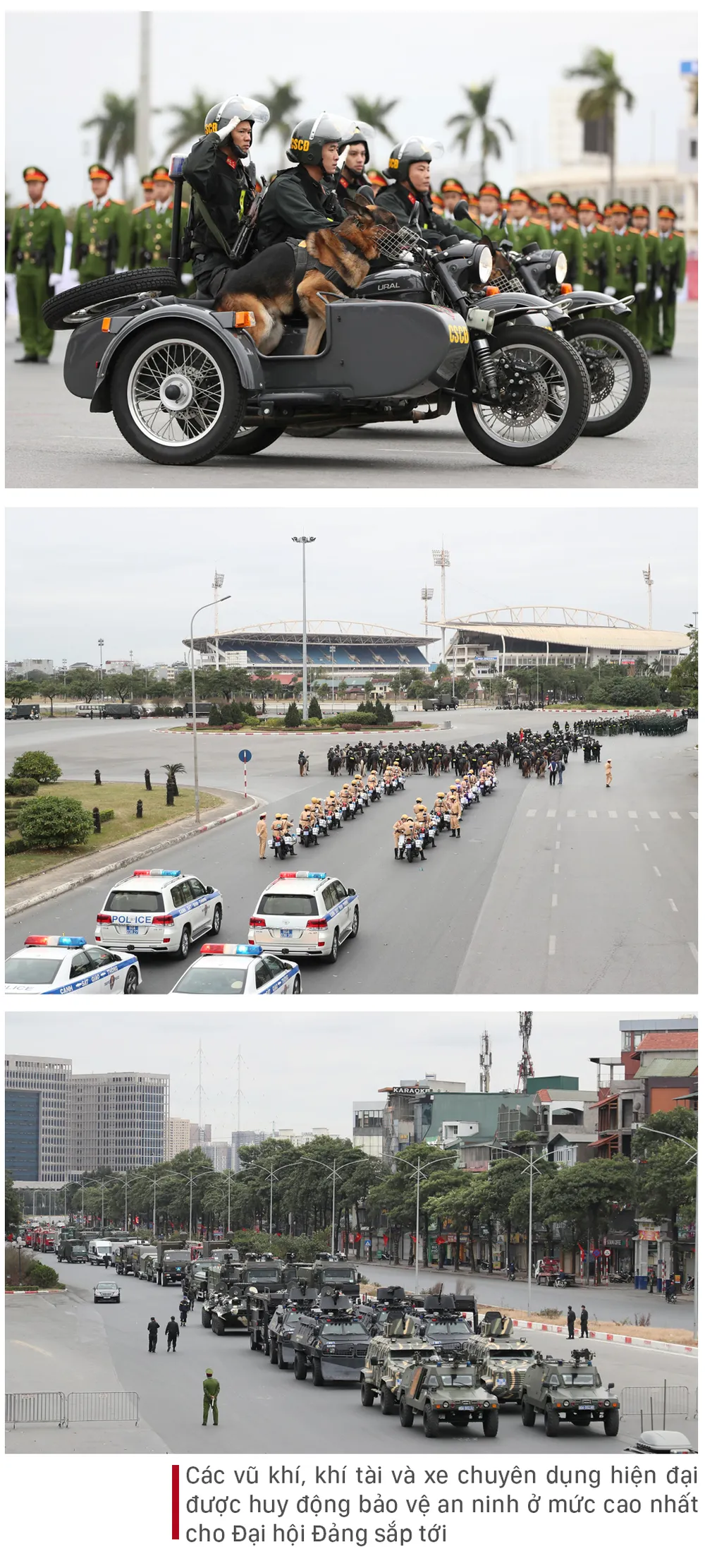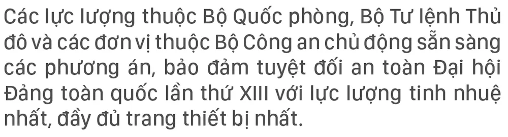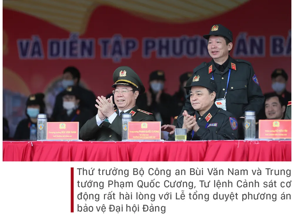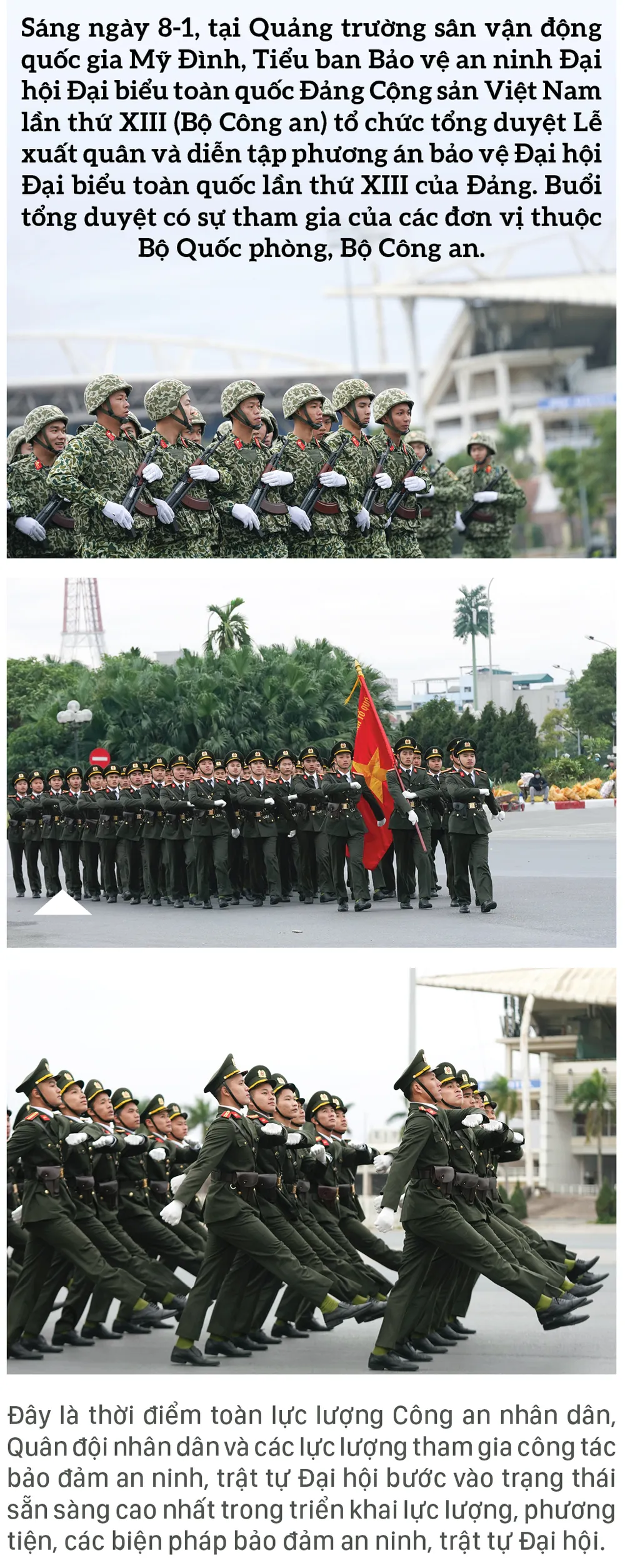 Sáng ngày 8-1, tại Quảng trường sân vận động quốc gia Mỹ Đình, Tiểu ban Bảo vệ an ninh Đại hội Đại biểu toàn quốc Đảng Cộng sản Việt Nam lần thứ XIII (Bộ Công an) tổ chức tổng duyệt Lễ xuất quân và diễn tập phương án bảo vệ Đại hội Đại biểu toàn quốc lần thứ XIII của Đảng. Buổi tổng duyệt có sự tham gia của các đơn vị thuộc Bộ Quốc phòng, Bộ Công an.