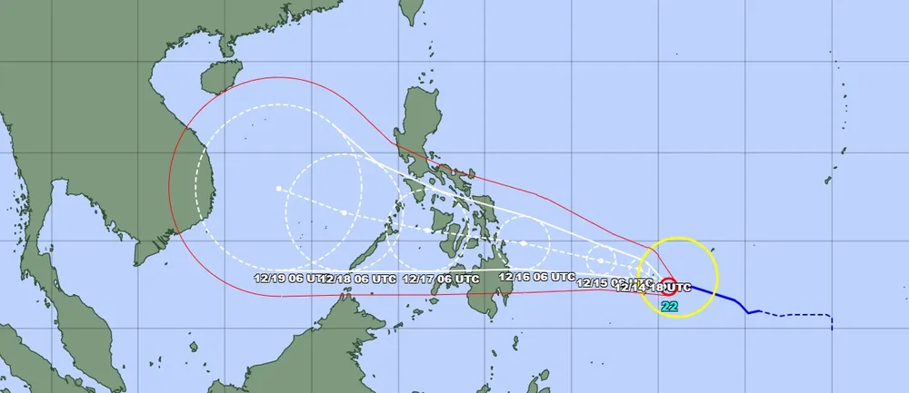 Cơ quan khí tượng Nhật Bản thông tin, chiều 14-12, tâm bão RAI ở khoảng 7,4 độ vĩ Bắc - 135,6 độ kinh Đông. Cơn bão này di chuyển với tốc độ “siêu tốc” (30 km/giờ) theo hướng Tây. Ngày 16-12, bão RAI sẽ trở thành siêu bão khi đi vào miền Nam Philippines.