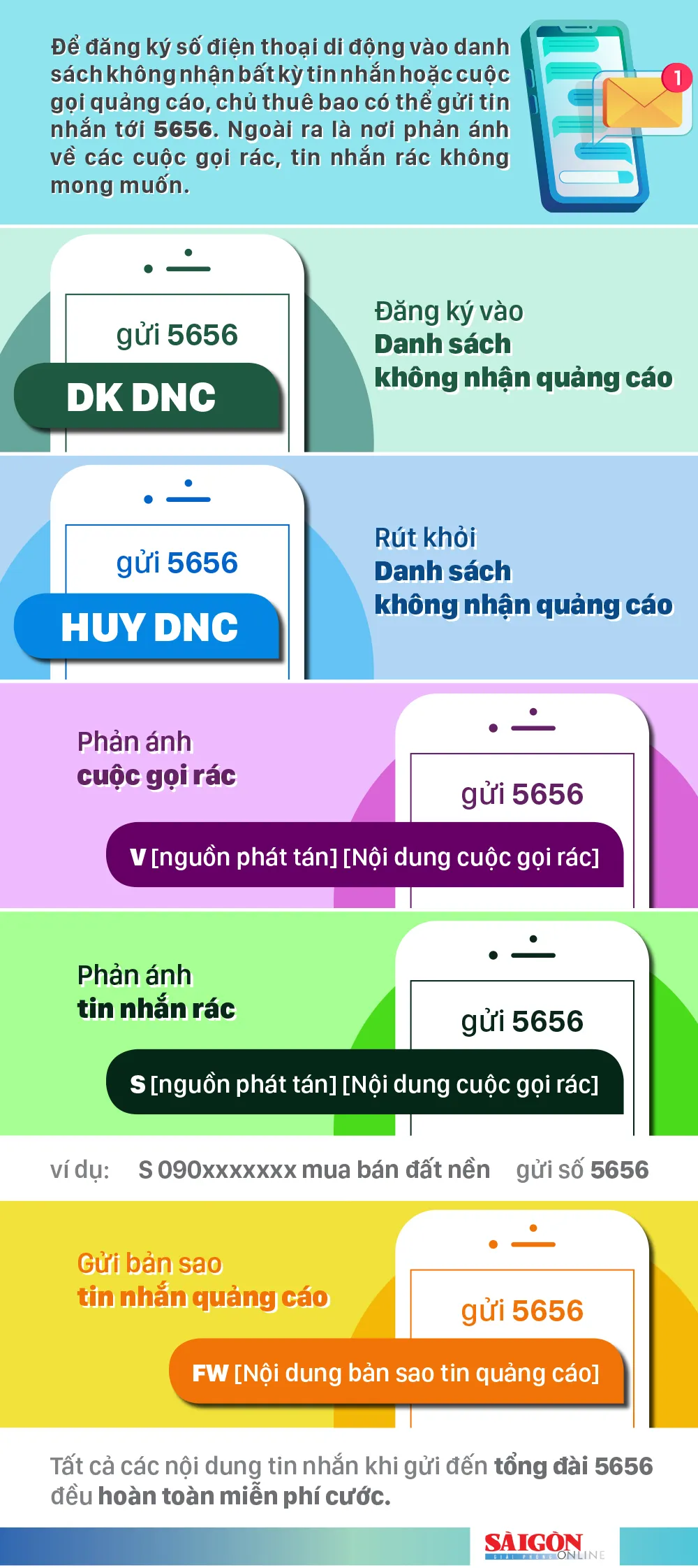 Để đăng ký số điện thoại di động vào danh sách không nhận bất kỳ tin nhắn hoặc cuộc gọi quảng cáo, chủ thuê bao có thể gửi tin nhắn tới 5656. Ngoài ra là nơi có thể phản ánh về các cuộc gọi rác, tin nhắn rác không mong muốn.