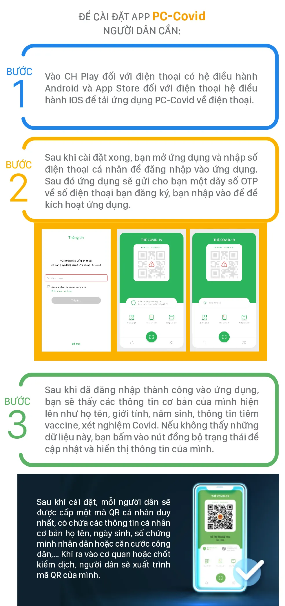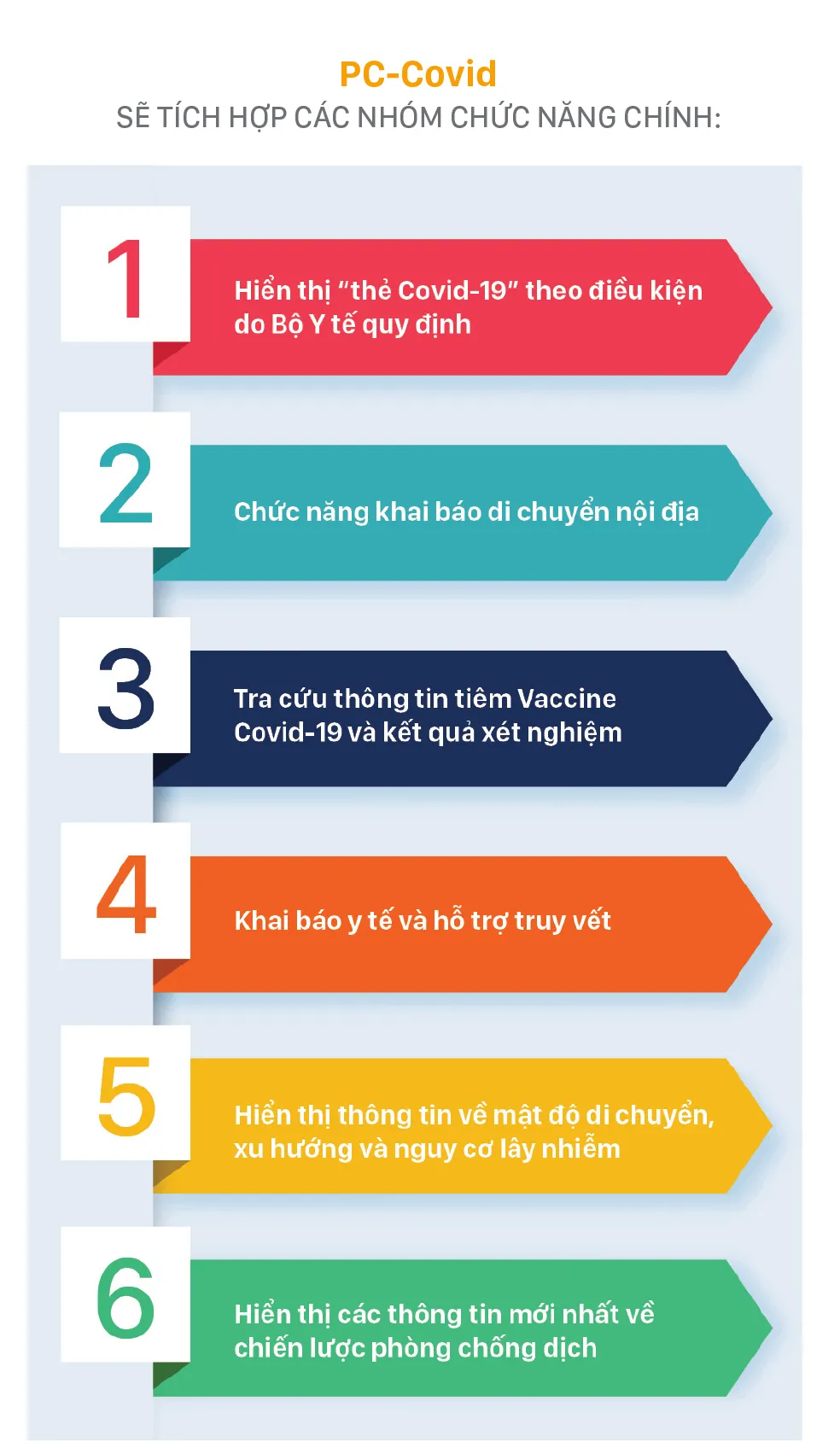 Theo thông tin từ Bộ Thông tin và Truyền thông, app PC - Covid sẽ chính thức thay thế và tích hợp các ứng dụng phòng chống Covid-19 trên smartphone hiện nay như: Bluezone, NCOVI, Tờ khai y tế, khai báo mã QR, quản lý xét nghiệm… Hiện app đã có mặt rên hai chợ ứng dụng Google Play và Apple Store.