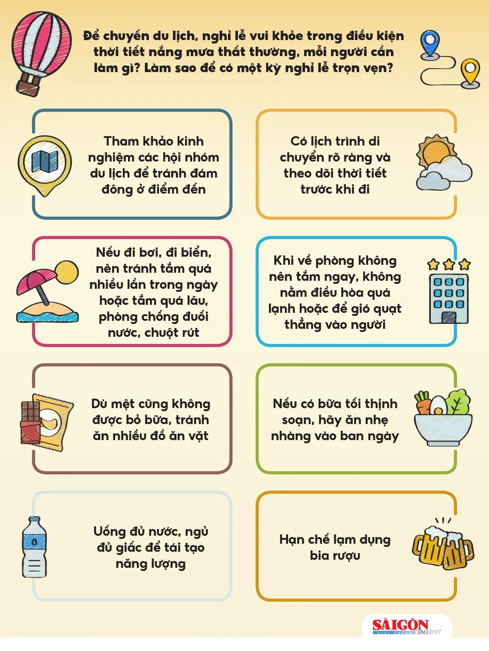 Để chuyến du lịch, nghỉ lễ vui khỏe trong điều kiện thời tiết nắng mưa thất thường, mỗi người cần làm gì? Làm sao để có một kỳ nghỉ lễ trọn vẹn?