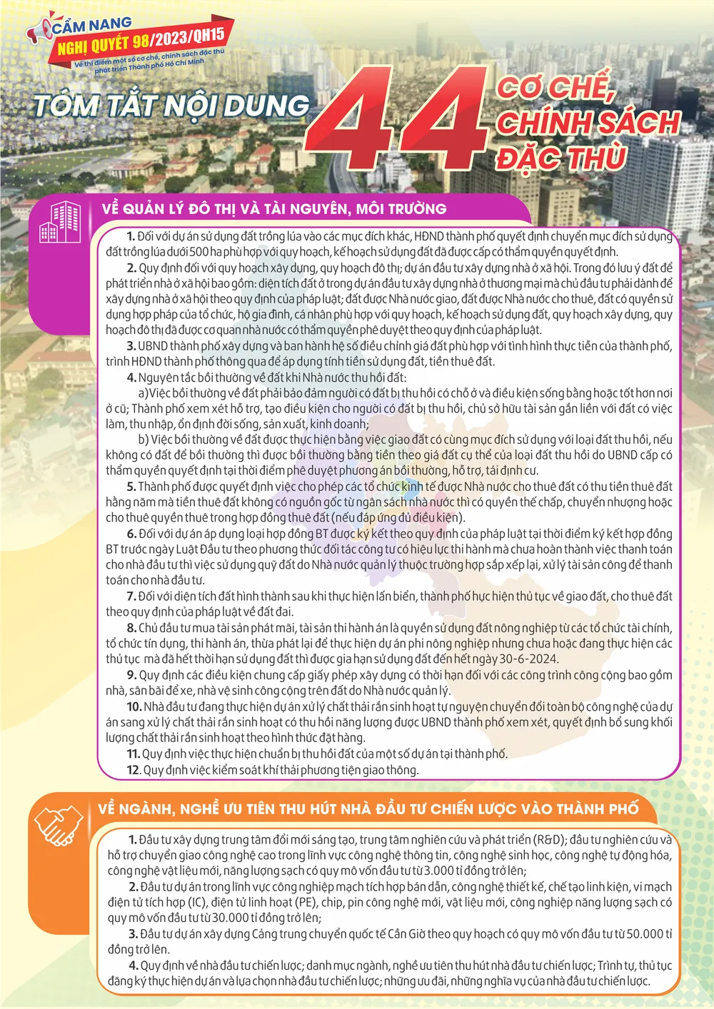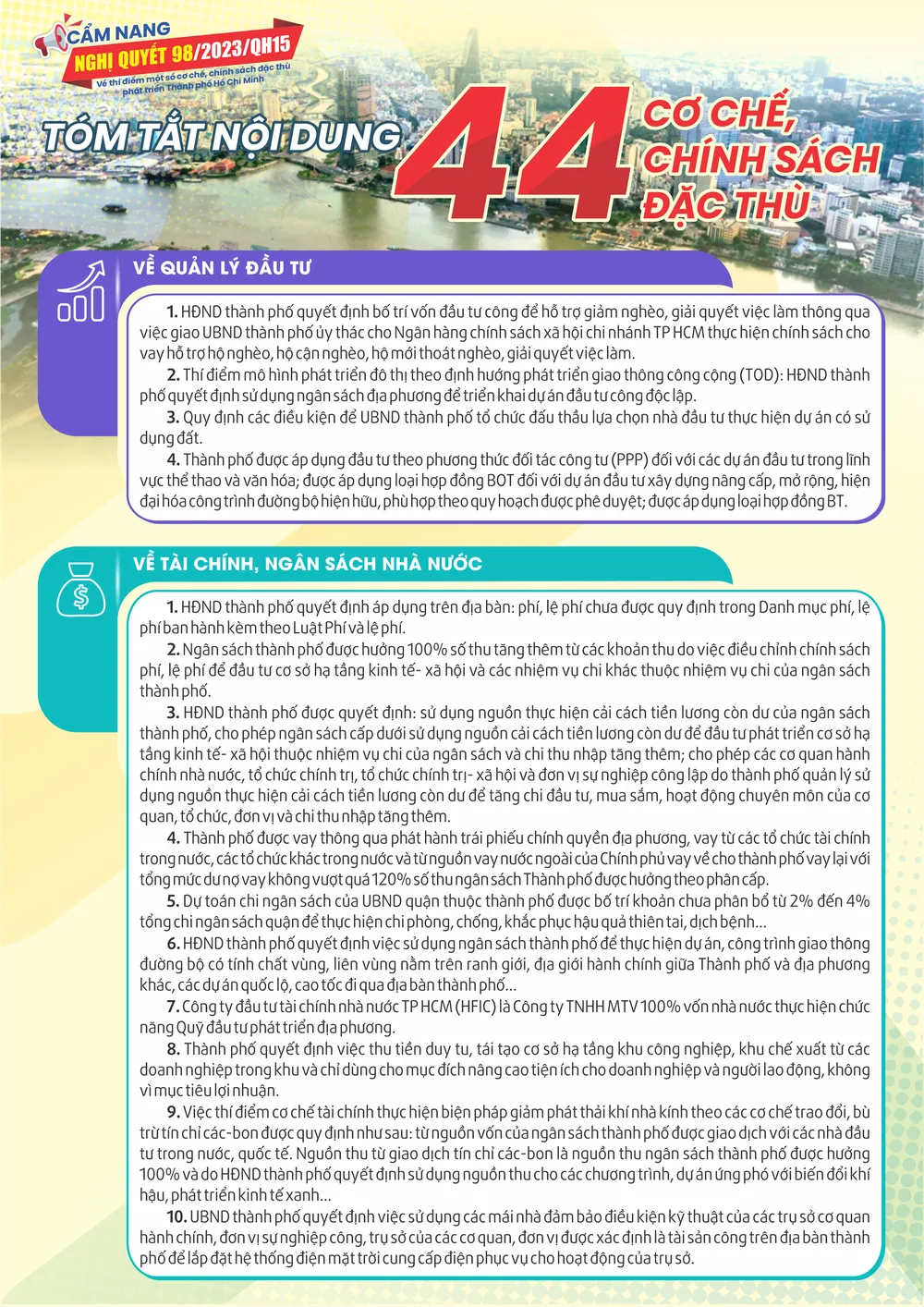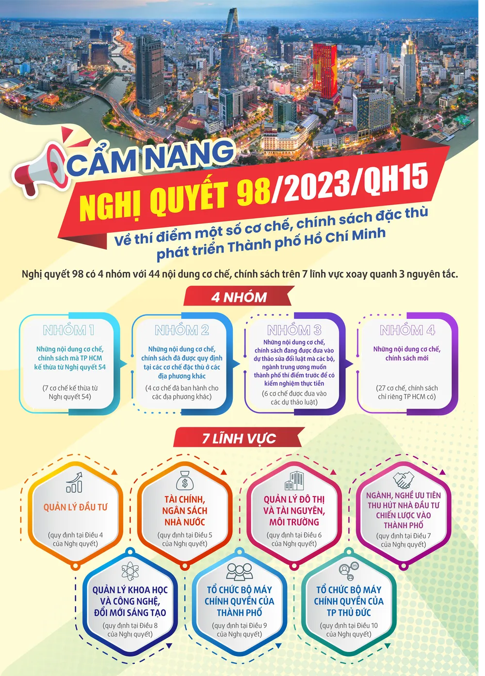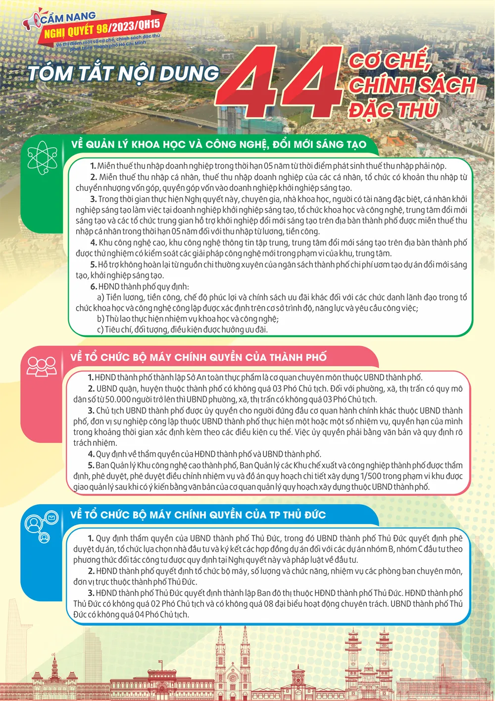 Nhằm tuyên truyền các nội dung của Nghị quyết 98, nhóm tác giả đến từ Báo Người Lao Động thực hiện Infographic "Cẩm nang tuyên truyền các nội dung Nghị quyết 98/2023/QH15 về thí điểm một số cơ chế, chính sách đặc thù phát triển TPHCM". Sản phẩm đoạt Giải Ba tại "Hội thi Thiết kế sản phẩm đồ họa thông tin tuyên truyền Nghị quyết 98" _ do Sở TT-TT phối hợp Thành đoàn TPHCM và Báo SGGP tổ chức.