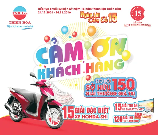 Đặc biệt đến với Thiên Hòa trong dịp sinh nhật lần thứ 15, bên cạnh cơ hội mua sắm hấp dẫn, khách hàng còn có cơ hội trúng thưởng lớn với tổng giá trị giải thưởng lên đến 1,5 tỷ đồng. Trong đó, đáng chú ý nhất là 15 giải đặc biệt gồm 15 xe Honda Shi trị giá 80.000.000đ và 15 giải tri ân gồm 15 Smart Tivi 43 inch trị giá 15 triệu đồng/giải của các thương hiệu nổi tiếng Sony, Samsung, LG. Cùng với đó là 120 giải khuyến khích mỗi giải là 1 phiếu mua hàng trị giá 1 triệu đồng.