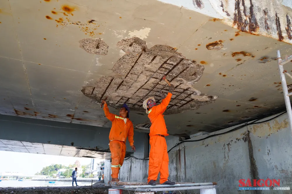 Những vị trí bê tông bong tróc tại dầm và trụ cầu sẽ được sửa chữa, bổ sung lớp bảo vệ cốt thép bằng vật liệu chống ăn mòn, hạn chế tác động của nước biển.