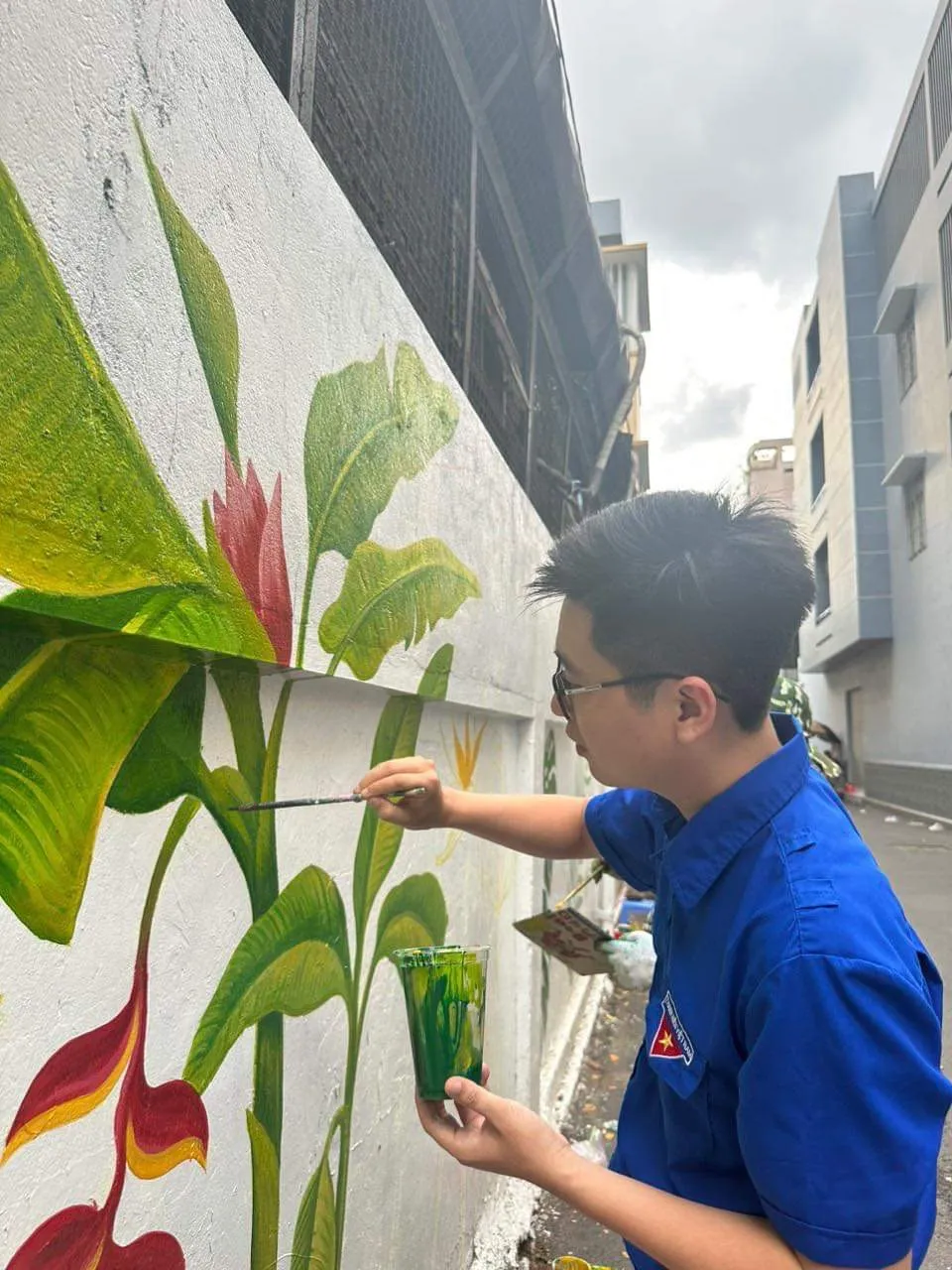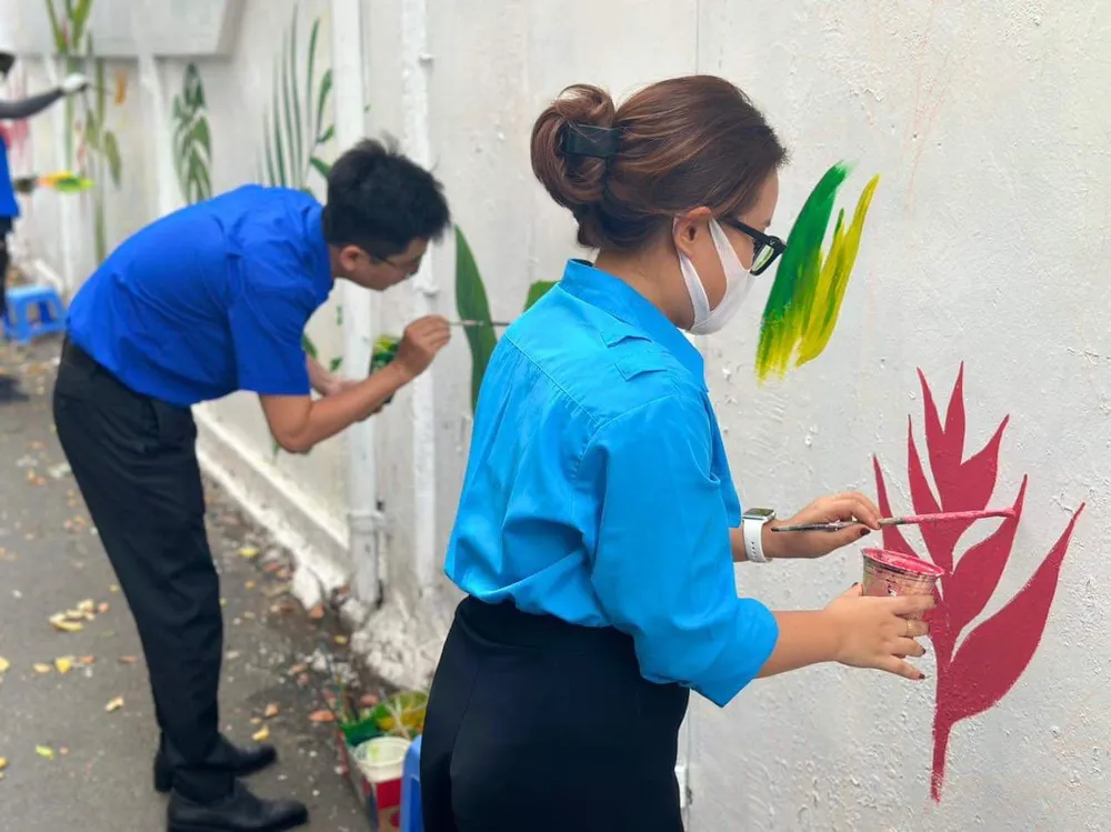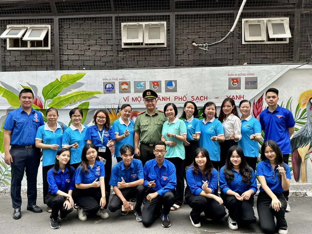 Đoàn viên của phường Đa Kao tham gia vẽ lại mảng tường. Ảnh: CHÍ THẠCH |