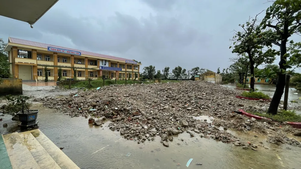 Trường THCS Trường Thủy có một dãy nhà cấp 4 bị sập, địa phương cho tháo dỡ từ năm 2020, đến nay chưa có vốn xây mới khiến 400 học sinh phải học ghép chật chội
