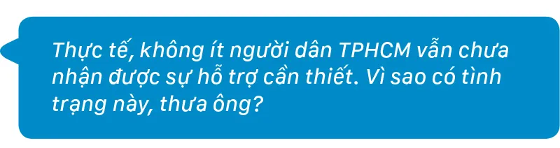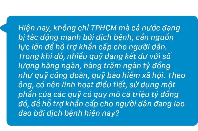 Khó khăn của người dân TPHCM giờ đây không hẳn là không có tiền, mà còn nhiều khó khăn khác khi đi lại hạn chế, công ăn việc làm đình trệ. Trong lúc này, việc triển khai hỗ trợ, thực hiện an sinh cho càng nhiều người được nhận là càng tốt. Trước mắt, cần triển khai sớm việc chi hỗ trợ lần 2 bổ sung để tiền hỗ trợ đến sớm nhất với hơn 1 triệu hộ dân, trên 669.000 lượt lao động tự do. Đồng thời, cần cấp phát nhanh chóng 2 triệu túi an sinh tới người dân. Làm sao để tiền hỗ trợ, quà hỗ trợ đến nhanh nhất với người dân trong lúc này. Việc đi chợ giùm nhiều nơi đã làm khá tốt và giờ đây có hình ảnh bộ đội cùng phối hợp đi chợ giúp dân, phát lương thực thực phẩm cho dân, người dân rất ấm lòng. Các địa phương có thể hình thành các combo đi chợ giúp một cách cụ thể hơn, đáp ứng sát hơn nhu cầu thì người dân sẽ an tâm ai ở đâu ở yên đó.