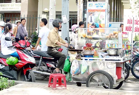 Một số người bán hàng rong tụ tập trước cổng Trường Đại học Khoa học Tự nhiên trên đường Nguyễn Văn Cừ, P4, Q5, TPHCM gây mất mỹ quan đô thị (ảnh).
