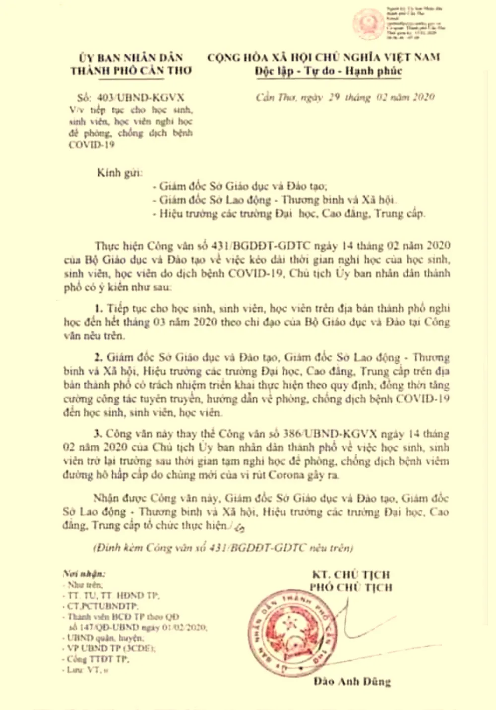 Cụ thể, công văn này mang số 403/UBND-KGVX (ngày 29-2-2020) do ông Đào Anh Dũng, Phó Chủ tịch UBND TP Cần Thơ ký với nội dung chính là “tiếp tục cho học sinh, sinh viên, học viên trên địa bàn nghỉ hết tháng 3 năm 2020” để phòng bệnh Covid-19".