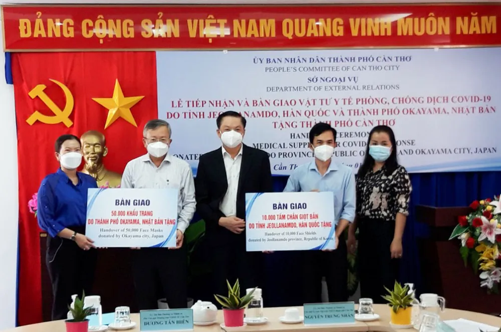 Tại buổi lễ, đại diện TP Okayama (Nhật Bản) đã trao hỗ trợ 50.000 khẩu trang lọc bụi 3 lớp (trị giá hơn 300 triệu đồng) cho TP Cần Thơ nhằm phục vụ công tác phòng, chống dịch Covid-19.