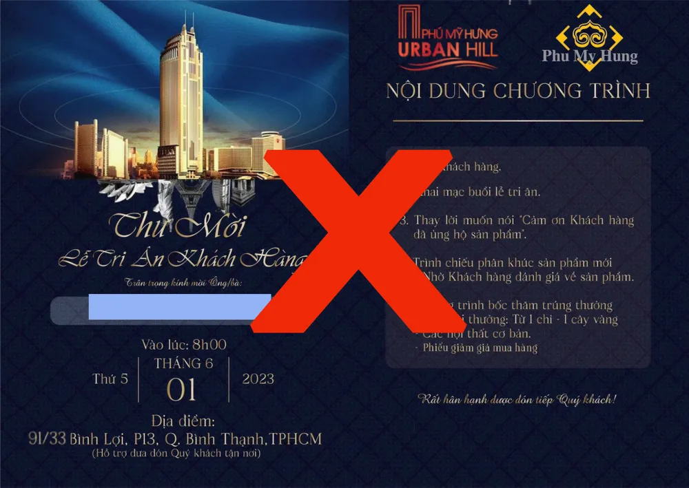 Công ty Phú Mỹ Hưng nhận nhiều thông tin phản ánh của khách hàng, cư dân và đối tác về việc bị nhiều tổ chức, cá nhân xưng danh là nhân viên Công ty Phú Mỹ Hưng gọi điện, nhắn tin mời tham dự sự kiện tại quận Bình Thạnh, Tân Phú, Tân Bình… với nội dung giới thiệu “đây là chương trình tri ân dành cho cư dân, khách hàng, đối tác Phú Mỹ Hưng”, kèm theo đó là lời hứa tặng quà giá trị như vàng, voucher du lịch, mua sắm…”