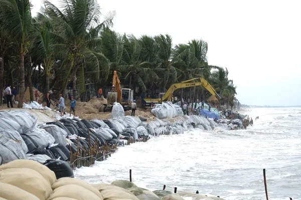Một số vị trí, chỉ trong một vài ngày, sóng cao gây sạt lở và ăn sâu vào đất liền hơn 10m, tạo thành những bờ vực cao hơn 5m. Toàn bộ bờ kè mềm với hàng ngàn bao cát, cọc tre và hàng dừa bị sóng phá tan tành, đe doạ cuốn các công trình nhà hàng, nhà dân và đường sá xuống biển.