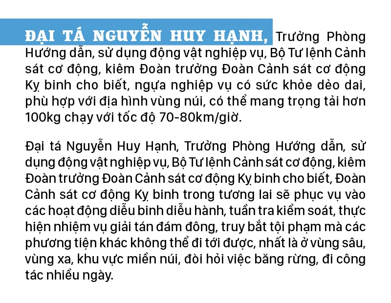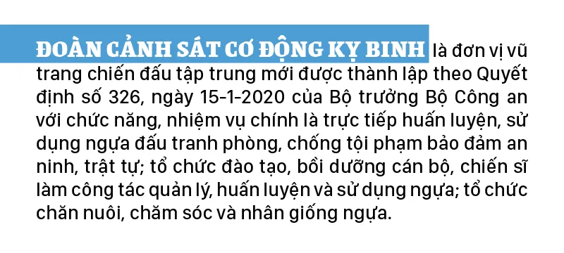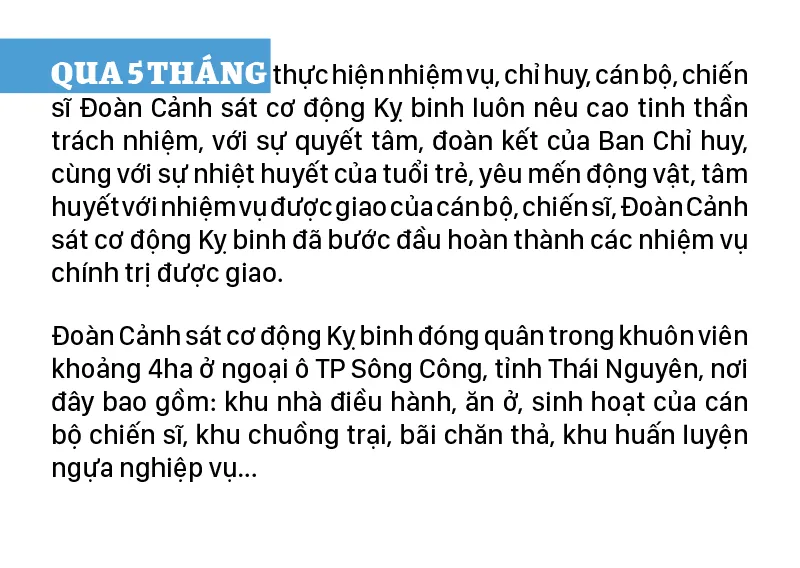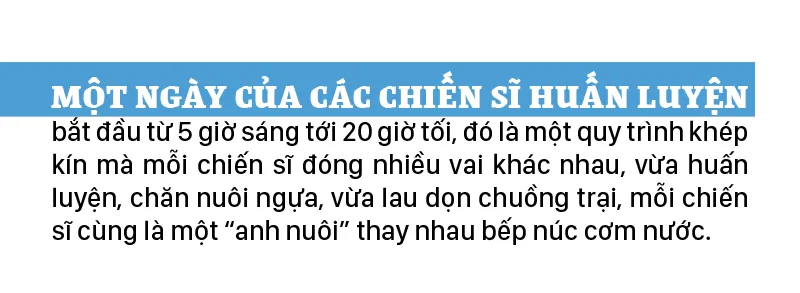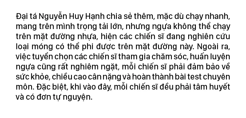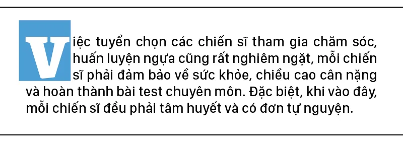 Việc tuyển chọn các chiến sĩ tham gia chăm sóc, huấn luyện ngựa cũng rất nghiêm ngặt, mỗi chiến sĩ phải đảm bảo về sức khỏe, chiều cao cân nặng và hoàn thành bài test chuyên môn. Đặc biệt, khi vào đây, mỗi chiến sĩ đều phải tâm huyết và có đơn tự nguyện.