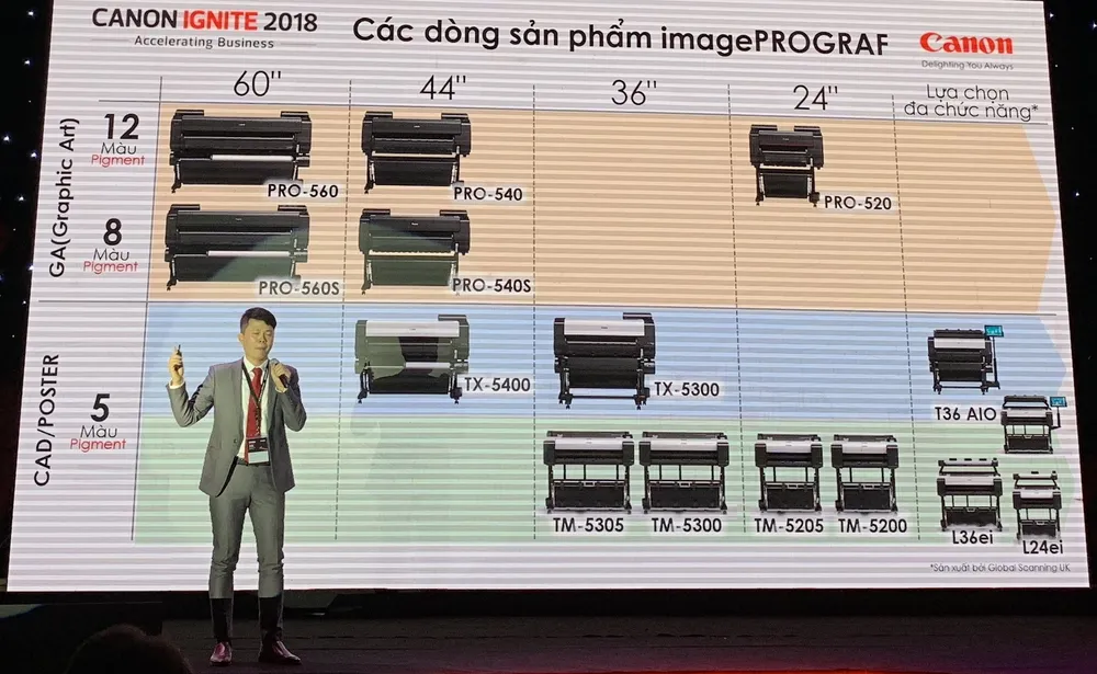 Các máy in gồm: bộ đôi loại 24-inch imagePROGRAF TM-5200 và imagePROGRAF TM-5205 cùng hai mẫu máy 36-inch là imagePROGRAF TM-5300 và imagePROGRAF TM-5305. Những mẫu máy in này đều thuộc dòng imagePROGRAF TM, được thiết kế đặc biệt cho phân khúc doanh nghiệp vừa và nhỏ hiện rất phổ biến tại Việt Nam.